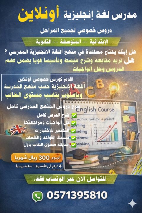 معلم سوري الجنسية تأسيس ومتابعة وقراءة وكتابة وتدريس جميع مواد المرحلة الابتدائية (عربي رياضيات إنكليزي) وجميع مواد المرحلة المتوسطة للتواصل والاستفسار أو على الرقم السعر الشهري للطالب ضمن الجروب 500 ريال ودورة خاصة 1000 ريال