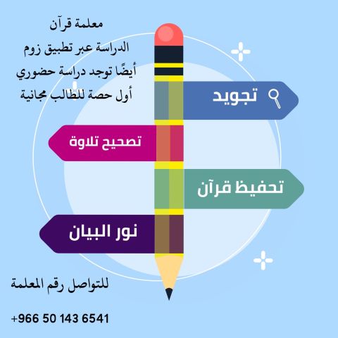 معلمة قرآن متخصصة في تعليم وتحفيظ الاطفال مع التركيز على التلاوة الصحيحة والتفسير البسيط واحكام التجويد تهدف الى تنمية حب الطالب للقرآن وتنمية مهاراته في التلاوة وتحفيزه على الحفظ وفهم معاني الأيات بأساليب تدريس مبتكرة وجذابة. الدراسة عبر تطبيق زوم متاح دراسة حضوري أول حصة مجانا