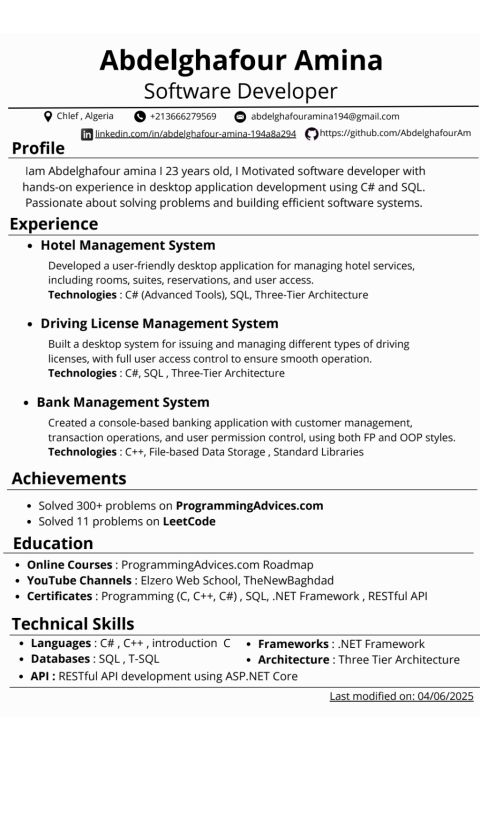مطور. NET يمتلك خبرة عملية تزيد عن 3 سنوات في تطوير واجهات برمجة التطبيقات (APIs) والتطبيقات الخلفية باستخدام ASP. NET Core و C يتميز بالدقة والالتزام بمعايير البرمجة النظيفة (Clean Code) واتباع مبادئ SOLID، مع خبرة قوية في العمل ضمن الأنظمة متعددة الطبقات (Layered Architecture) يمتلك خبرة واسعة في التعامل مع Entity Framework Core، LINQ، SQL Server وتصميم واجهات RESTful عالية الكفاءة