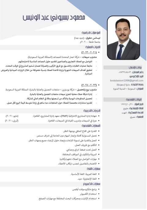 أنا محمد السوداني اعمل حاليا (كمدير تجاري) في المملكة وامتلك خبرة واسعة تتجاوز 12 عاما في قيادة المبيعات والتسويق وتطوير الأعمال داخل أسواق متعددة في السودان ومصر والامارات وقمت ببناء استراتيجيات تجارية فعالة، واطلاق نماذج أعمال ناجحة، وقيادة فرق عالية الأداء لتحقيق نتائج باهرة في الايرادات والحصة السوقية وبناء شراكات استراتيجية تعزز تنافسية المؤسسة وعلى متها التجارية. السيرة الذاتية متاحة عند الطلب