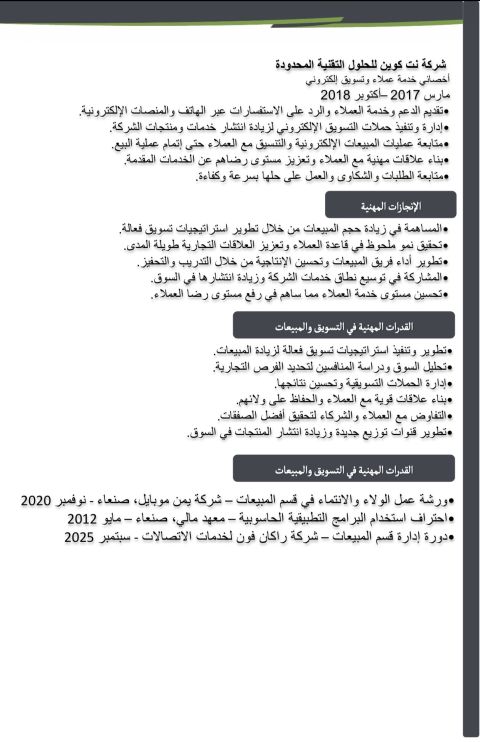 متمكن في المبيعات والتسويق بخبرة عملية قوية في تطوير الأعمال وتحقيق النمو، امتلك مهارات تحليلية متميزة وقدرة على بناء علاقات ناجحة مع العملاء وتعزيز ولأيهم. أسعى للانضمام الى جهة طموحة أساهم في تحقيق أهدافها بكفاءة، وأقدم قيمة حقيقية من خلال الالتزام، الجدية، والعمل بروح الفريق واحد لتحقيق أفضل النتائج تحت أي ضرف