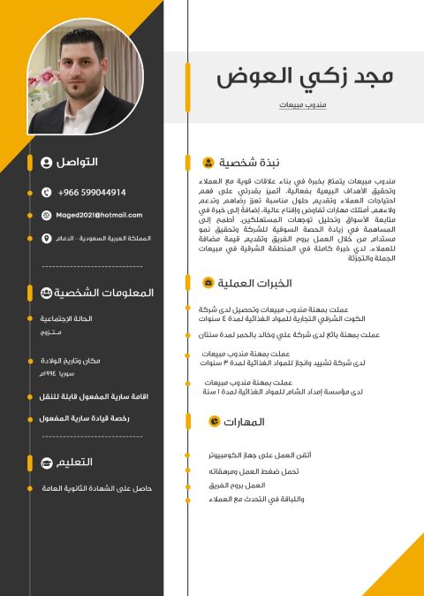سوداني 34 سنة مقيم في الرياض مدير ومشرف مبيعات وتسويق خبرة في المبيعات والتسويق B2B وB2c أكثر من 10 سنوات وخبرة كبيرة في السوق السعودي متخصص في تحليل السوق وإدارة العلاقات مع العملاء والتفاوض وتحقيق أعلى معدل مبيعات خبرة كبيرة في مجال الاجهزة الكهربائية والمنزلية والدعاية والاعلان والخدمات اللوجستية وإدارة المعارض عملت مدير مبيعات في عدة شركات وصنعت الفرق وقد مت اضافة حقيقة في رفع نسبة المبيعات