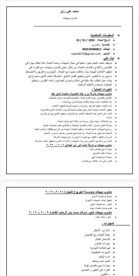 أنا محمد أنور مقيم في السعودية عمري 26 سنة لدي خبرة في مجال المبيعات خبرة 7 سنوات في مجال العطور أستطيع التعامل مع العملاء وتحقيق التارجت كما أستطيع اقتراح أفكار لزيادة المبيعات كما عملت في فندق وأستطيع التعامل مع برنامج نزيل
