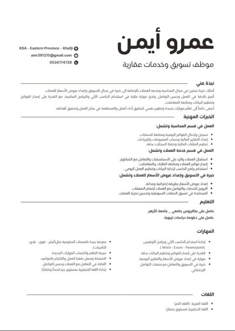 أرغب في فرصة عمل في مجال العقار وإدارة الأملاك داخل المنطقة الشرقية حاصل على ليسانس ودبلومة ومعي خبرة سنتين في مجال المحاسبة وادخال البيانات وخدمة العملاء، أجيد استخدام الحاسب والتعامل مع العملاء وحل المشكلات بسرعة كما أني قادر على متابعة شؤون المستأجرين والصيانة الدورية وتحديث العقود والتعامل مع المنصات الحكومية بكل سهولة، مع القدرة على التعلم السريع، وملتزم ومهتم بتطوير نفسي