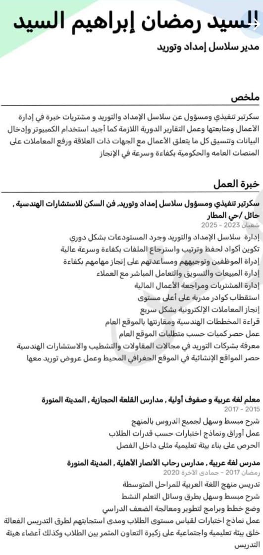 سكرتير تنفيذي ومسؤول سلاسل إمداد وتوريد موجود في حائل مصري مؤهل جامعي وأحمل إقامة نظامية ورخصة قيادة سعودية مع إتاحة نقل كفالة