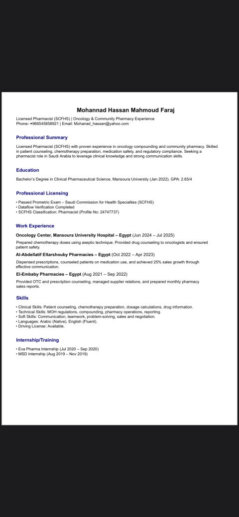 I am a licensed pharmacist with solid experience in community pharmacies and hospital settings. My background includes community pharmacy experience in large pharmacy chains. Medication dispensing, patient counselling, and OTC management. clinical pharmacy background and strong knowledge of treatment protocols. I hold a valid Saudi commission for health specialities. I am ready to join immediately