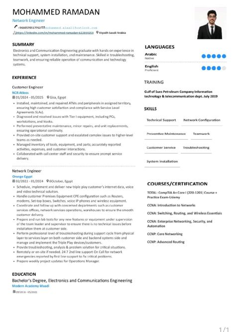 أنا مهندس اتصالات مصري الجنسية، مقيم في مدينة الرياض، وابحث عن فرصة عمل في المجالات التالية مهندس شبكات مساعد IT المؤهل العلمي بكالوريوس هندسة الاتصالات المهارات خبرة في إدارة الشبكات والدعم الفني. القدرة على حل المشكلات التقنية. مهارات تواصل قوية وخدمة العملاء باحترافية. متواجد حاليا في الرياض وجاهز للعمل فورا. CCNA, CCNP, Comptia A core 1