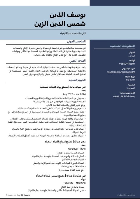 فني ميكانيكا صيانة سوداني الجنسية خبرة 7 سنوات في مجال مصانع المياه وزيوت السيارات وخبرة جيدة في صيانة مولدات الكهرباء إقامة مهنية سارية ورخصة قيادة نقل خفيف