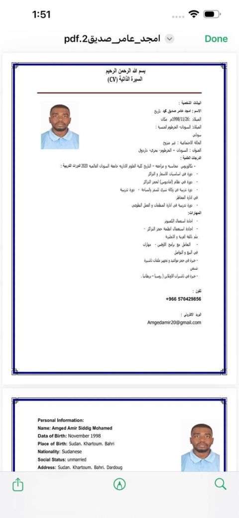 أنا سوداني وابحث عن فرصة عمل مناسبة داخل المملكة العربية السعودية. لدي خبرة في مجال حجز واصدار تذاكر الطيران وأنظمة Amadeus وNDC وAkbar Travel وحجوزات البواخر جاهز للعمل فورا وفي أي مدينة داخل المملكة