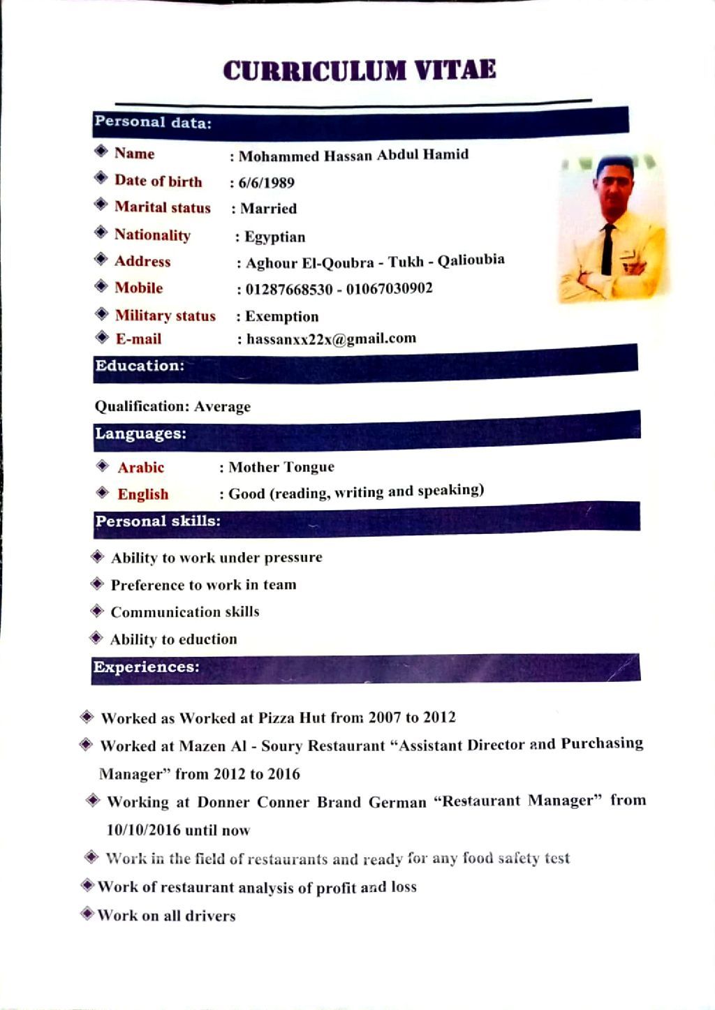 مدير مطعم خبرة في مجال المطاعم والمقاهي أجيد التعامل مع الحاسب الآلي وبرامج التشغيل في حساب التكاليف المالية وعمل موازنة للمطعم في الربح والخسارة