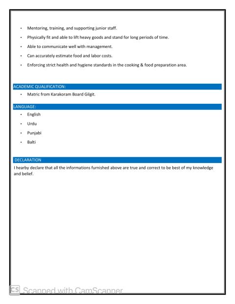 Job Application (Chef/ Grill Master) Dear Sir, Greetings, I am looking for a job opportunity. I have more than 10 years of experience in Saudi Arabia in the restaurant field. I am skilled in preparing Charcoal chicken, kebab, kabsa rice, grilled items, maqluba, bukhari rice, salads, and many other dishes. I can work under pressure, maintain cleanliness and food quality, and work well in a team