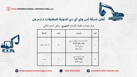 متوفر لدينا معدات ثقيلة للإيجار الشهري، حفارة مجنزرة CAT DL 330 موديل 2019 عدد (6) لودر (شيول) CAT 950 موديل 2020 عدد (1) موقعنا الرياض
