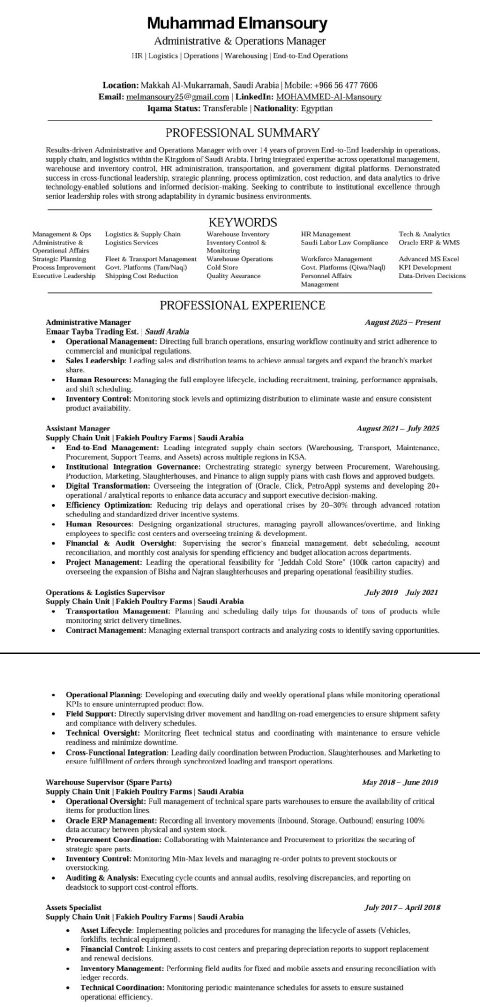 ابحث عن عمل بخبرة ادارية وتشغيلية 15 عام في قيادة العمليات ورفع الكفاءة، وأسعى لتحويل هذه الخبرة الى نتائج ملموسة لم نظمتكم ضبط اداري، تخفيض تكاليف، وتطوير أداء مستدام. جاهز لأي عمل اداري. خبرة ب إدارة شاملة الشؤون الادارية، شؤون الموظفين، والموارد البشرية. خبرة تشغيلية ميدانية لوجستيات، إدارة مستودعات ومشتريات تحليل واستراتيجية تحليل البيانات، وإدارة الفروع اجادة العمل على أنظمة ERP ومايكروسوفت