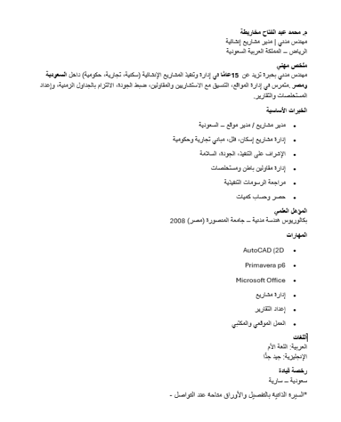 مهندس مدني ذو خبرة تزيد عن 15 عاما في إدارة الإنشاءات، والاستشارات الهندسية، والاشراف على المواقع كمقاول أيضا في كل من مصر والمملكة العربية السعودية. يتمتع بخلفية قوية في إدارة المشاريع السكنية والحكومية. يمتلك سجلا مثبتا في تسليم المشاريع في الوقت المحدد وضمن الميزانية، مع القدرة على قيادة الفرق، وتحسين أداء المواقع، وضمان الالتزام الكامل بالمتطلبات والمواصفات الفنية