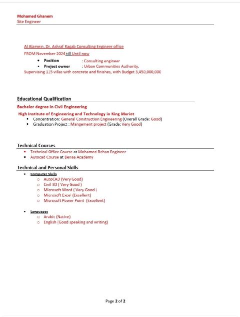مهندس مدني خبرة 7 سنوات في التنفيذ والاشراف على التنفيذ وعمل المستخلصات وحصر الكميات ومتابعة سير الأعمال لضمان الالتزام بالجداول الزمنية وجودة التنفيذ كما أتمكن من مراجعة المخططات والتنسيق بين جميع التخصصات لضمان سير المشروع بسلاسة كمان أتمكن بفضل الله عز وجل من العمل على برامج (Excel, AutoCAD, Civil 3D)