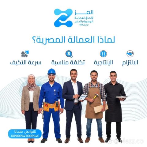Al - Ezz Company for the Recruitment of Egyptian Labor Abroad License No. 568 from the Egyptian Ministry of Labor announces the provision of all types of professional and craft trained Egyptian labor and all specialties for companies, institutions and restaurants as soon as possible More than 15 years of experience with a previous business with elite companies in the Saudi market