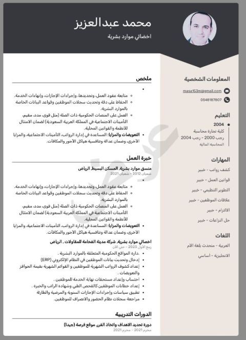 أنا أخصائي موارد بشرية وشؤون ادارية، سوداني الجنسية، خبرة أكثر من 10 سنوات في مجال الموارد البشرية، دراية تامة بمتابعة جميع المنصات الحكومية، الالمام التام بكل ما يتعلق بعمل وآلية الموظف من استقطاب الموظفين وترشيحهم وتعيينهم وصياغة العقود، وتقيمهم، والاجازات والمخالصات النهائية، والتأمين الطبي واعداد الرواتب، واعداد لائحة السياسات والاجراءات للمنشأة