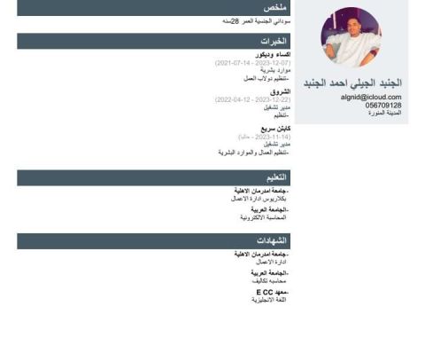 موظف موارد بشرية وعلاقات عامة وحكومية GRO. خبرة بالمواقع الحكومية مثل قوى ومدد ومقيم والتأمينات الاجتماعية وغيرها. عملت في متجر الكتروني مترجم ومسؤول لوجيستيك ومتابعة الطلبات ثم انتقلت بعدها لمكتب استقدام مترجم وعلاقات عامة بالاضافة الى شؤون الموظفين. انتقلت بعدها لشركة صيانة متخصص تسويق وموارد بشرية وبعدها عملت بشركة مقاولات مسؤول موارد بشرية وعلاقات حكومية