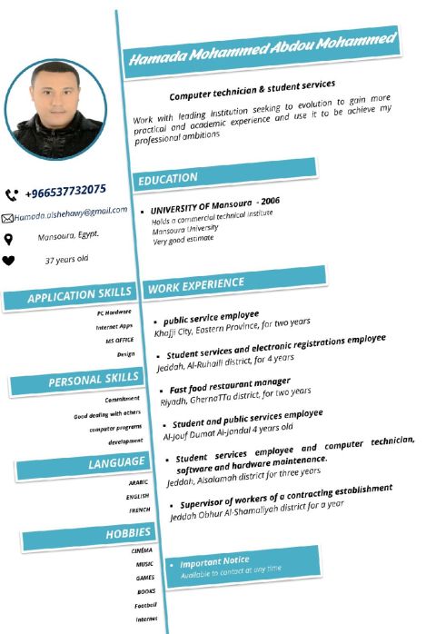 أنا حسين منصور من مصر موظف خدمات عامة وموارد بشرية خبرة في ابشر وقوى ومقيم وناجز ومعين وغيرهم وكل الامور القانونية ولدي خبرة في اعداد العقود، أتقن العمل على برامج Microsoft Excel وMicrosoft Word ابحث عن وظيفة في قسم الخدمات العامة أو الموارد البشرية عن بعد. متواجد في السعودية