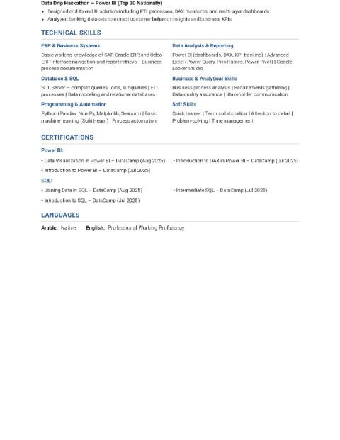 خريج هندسة اتصالات والكترونيات، مبتدئ في مجال أنظمة ERP. لدي معرفة أساسية ب SAP وOracle ERP وOdoo، مع خبرة في توثيق العمليات، تحليل البيانات، وانشاء التقارير باستخدام Excel وSQL وPower BI. عملت كمتدرب محلل بيانات ود عمت فرق العمل في فهم المتطلبات وتحسين العمليات. ابحث عن فرصة Junior ERP Assistant أو ERP Specialist للتعلم والتطور