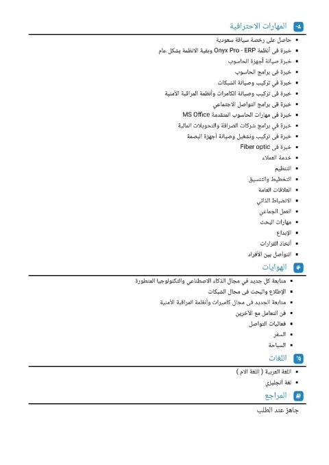 محترف تقني بخبرة واسعة في إدارة الأنظمة الآلية ERP. ONYX PRO. والمشتريات والمراسلات الدولية، بالاضافة الى مهارات تقنية متقدمة في صيانة وبرامج الحاسوب والشبكات وتركيب وصيانة كاميرات وأنظمة المراقبة الأمنية. الخ لبقية التفاصيل الاطلاع CV