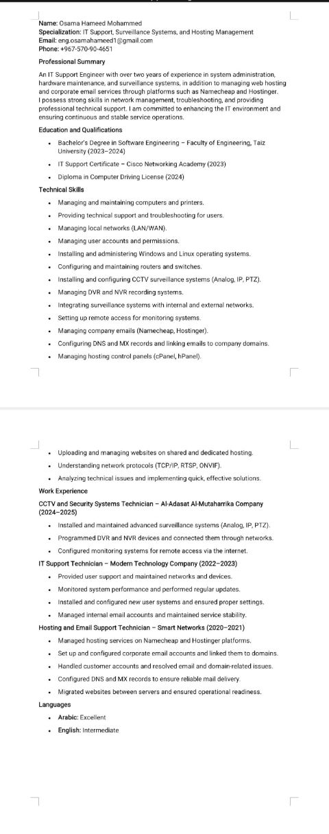 مهندس تقنية معلومات أخصائي دعم فني لدي خبرة 7 سنة في الدعم الفني خبرة في الشبكات وصيانة الاجهزة والطابعات واستكشاف الأخطاء وحل المشاكل ولدي خبرة في كاميرات المراقبة وVOIP وأنظمة ERP
