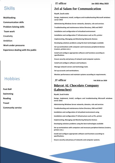مهندس شبكات خبرة أكثر من سنتين في مجال الشبكات والبنية التحتية لتقنية المعلومات وتصميم وصيانة الشبكات في المملكة العربية السعودية امتلك رخصة قيادة