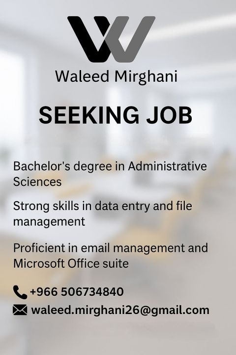 معكم وليد - حاصل على بكالوريوس العلوم الاداريه - بالاضافة لدورات قصيرة في مجال المهارات الاداريه، وإدارة الموارد البشرية. مهارات متوسطه في الحاسوب وتطبيقاته - وورد، اكسل، بوربوينت. بالاضافة لمهارات عالية في استخدام البريد الألكتروني وانشاء التقارير. مجتهد، منظم وسريع التعلم. في حال وجود أي استفسار أو اقتراح يمكنكم التواصل عبر الهاتف أو المراسلة عبر الوآتساب. شكرا لكم