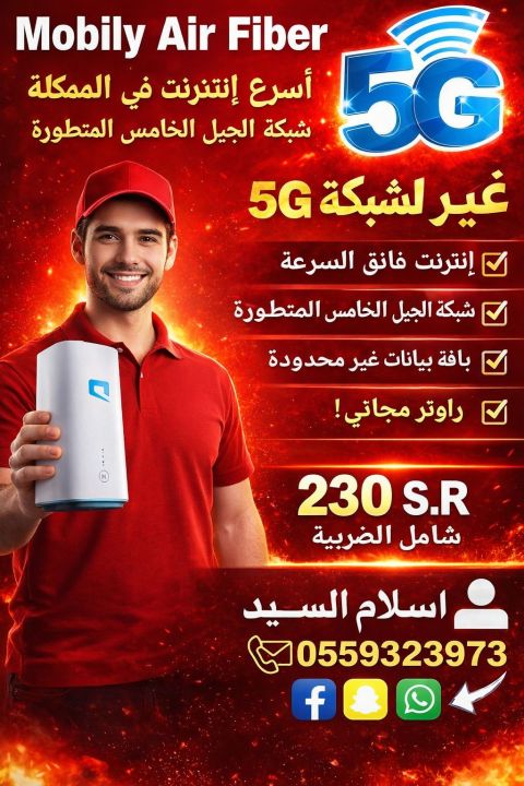 أقوى عرض انترنت موبايلي 5G بمناسبة عيد الفطر تعبت من بطء النت دلوقتي استمتع بسرعة خرافية مع باقة 5G انترنت لا محدود سرعة عالية وثابتة يشغل لغاية 64 جهاز بدون تقطيع راوتر 5G أحدث اصدار مجانا الاشتراك الشهري 230 ريال شامل الضريبة مبلغ تأمين 200 ريال ينخصم في فاتورة الشهر الرابع