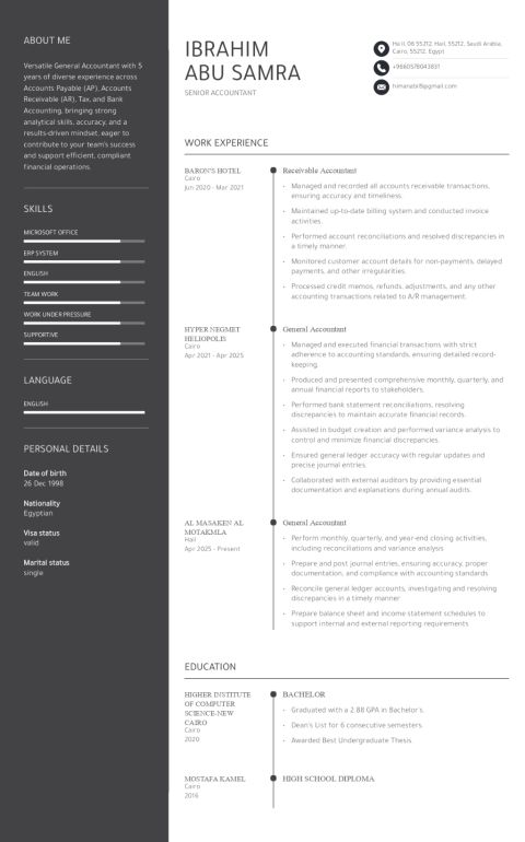 محاسب عام متعدد المهارات مع 5 سنوات من الخبرة المتنوعة في الحسابات الموردين (AP (الحسابات العملاء (AR (الضرائب، والمحاسبة البنكية، اعداد القيود والقوائم الماليه والحسابات الجردية والإقفالات، يتمتع بمهارات تحليلية قوية، دقة، وعقلية موجهة نحو النتائج، متحمس للمساهمة في نجاح فريقكم ودعم العمليات المالية الفعالة والمتوافقة عملت في المملكة لمدة 7 أشهر في الأعمال التالية تكوين شجرة حسابات - عمل دورة