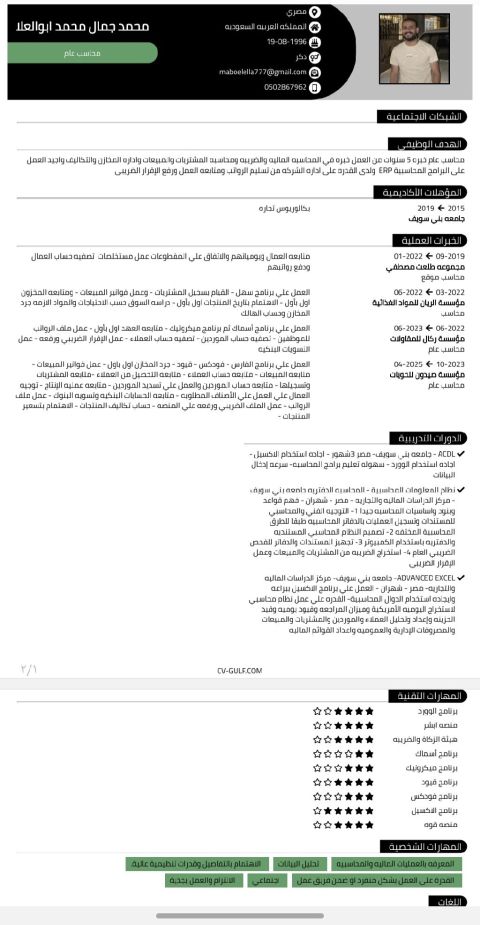 محاسب مصري خبرة خمس سنوات في القطاع الحكومي والخاص في مصر وسنة ونصف بالمملكة بشركة عناية بالسيارات أبحث عن عمل رقم