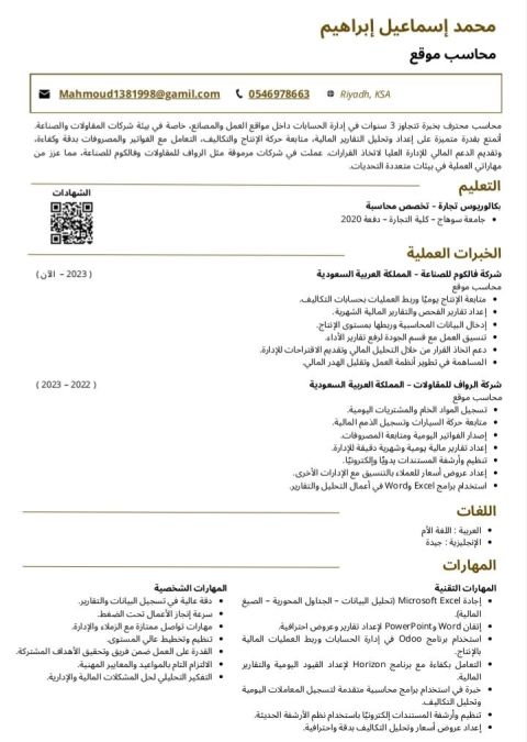 أنا اكرم طارق الحاج سوداني الجنسية، ابحث عن فرصة عمل في مجال المحاسبة المالية الخبرات العملية شركة توب كلين - الرياض المسمى الوظيفي محاسب الفترة من 2021 الى 2023 المهام الوظيفية. اعداد ومراجعة التقارير المالية. إدارة الحسابات اليومية ومعالجة الفواتير والمدفوعات المساهمة في تحسين العمليات المالية وتقديم التقارير لإلدارة استخدام البرامج المحاسبية لتنظيم وتحليل البيانات