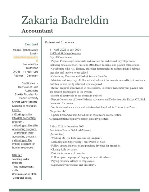 محاسب مالي سوداني خبرة في الحسابات في المملكة لمدة ثمان سنوات في مجالات المطاعم والمواد الغذائية والمبيعات وعملت على ادارة الحسابات وتدقيقها تدقيق حسابات البنوك ومراجعتها وتقديم التقارير الشهريه والدورية وتقارير الأرباح والخسائر ومراجعة حسابات الموردين ومراجعة تكاليف النشاط ورفع الاقرارات الضريبة وتقديم المشورة والاسهام في ترقية وتنظيم العمل في المنشاءة وابحث عن عمل ولدي اقامة سارية ورخصة قيادة