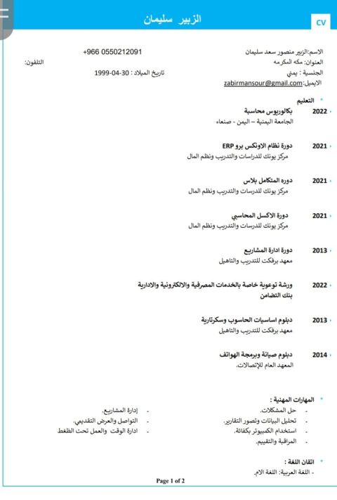 محاسب يمني أجيد استخدام البرامج المحاسبية وبرامج Office، حاصل على بكالوريوس تجارة شعبة محاسبة، خبرة أربع سنوات في نفس المجال. أقوم بتسجيل القيود اليومية - تسوية الحسابات البنكية - مراجعة وتصنيف العهد المالية - مطابقات حسابات الموردين والعملاء - اعداد التقارير الشهرية - اغلاق الصندوق - متابعة التحصيل من العملاء، جاهز للانتقال الى أي مكان بالمملكة، عندي إقامة سارية وقابلة للنقل