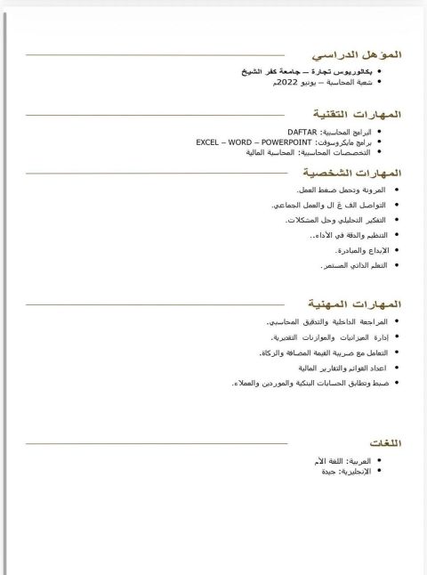 محاسب مصري حاصل ع بكالوريوس تجارة شعبة محاسبه (دفعه 2020) خبرة عملية 5 سنين في المحاسبة العامة لدي خبرة في تسجيل القيود اليوميه ومتابعه التقارير الماليه والجرد والمخزون أجيد التعامل مع برامج المحاسبة المختلفة وExcel وتتميز ب الدقة والتنظيم والالتزام ب العمل