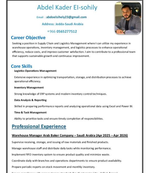 أمين مستودع خبرة سبعه سنوات في أسواق السد حان للمواد الغذائية ثلاث سنوات ومدير فرع في شركة سلاسل مطاعم صحية لين ميلز للوجبات الصحية ثم مدير المطبخ المركزي وأمين مستودع في شركة لين ميلز للوجبات الصحية خبرة أربعة سنوات والتعامل مع الموردين وخدمات التوريد. مدير مستودع مخابز وأمين مستودع في شركة جورميه كافية. أمين مستودع في شركة الحلول المتميزة الطيبة. سودان الجنسية خبرة في المجال الطبي سنوات. ERP Sy