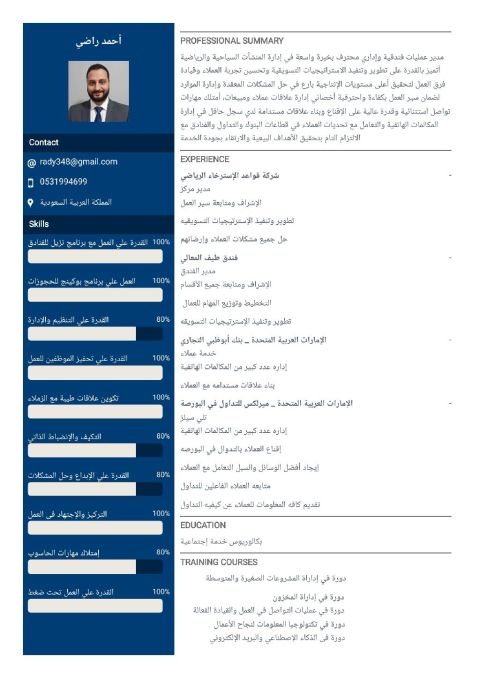 مدير عمليات فندقية واداري محترف بخبرة واسعة في إدارة المنشاءات السياحية والرياضية أتميز بالقدرة على تطوير وتنفيذ الاستراتيجيات التسويقية وتحسين تجربة العملاء وقيادة فرق العمل لتحقيق أعلى مستويات الانتاجية بارع في حل المشكلات المعقدة وإدارة الموارد لضمان سير العمل بكفاءة واحترفيه أخصائي إدارة علاقات عملاء ومبيعات، امتلك مهارات تواصل استثنائية وقدرة عالية على الاقناع وبناء علاقات مستدامة لدي سجل حافل