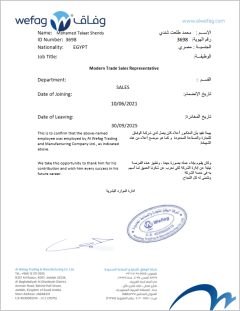 ابحث عن فرصة عمل في المبيعات (جملة / كبار عملاء) داخل المملكة. امتلك خبرة 5 سنوات في السوق، مع سجل حافل في تحقيق المستهدفات البيعية وبناء علاقات استراتيجية مع العملاء. المسمى الوظيفي الحالي مندوب مبيعات جملة. الخبرة المهنية عملت لدى شركة "الوفاق للصناعة والتجارة المحدوده" بمسميات (مبيعات جملة، كبار عملاء، قطاع التجزئة) المهارات الأساسية إدارة علاقات العملاء (CRM) تطوير الأعمال، التفاوض