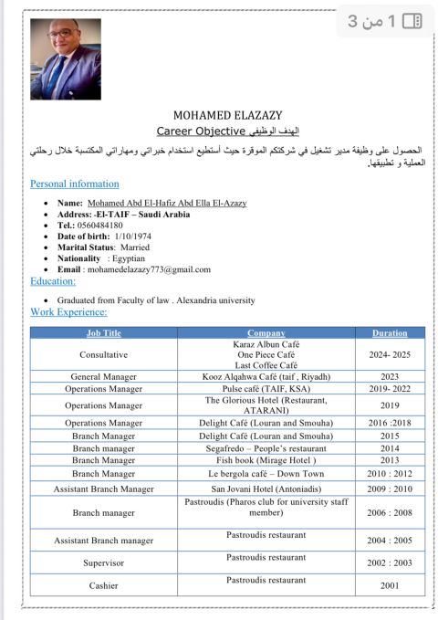 مدير تشغيل خبرة أكثر من 25 عام في مجال المطاعم والكافيهات تأسيس وتشغيل أكبر البراندات في منطقة الطائف تأسيس الشركات (نظام محاسبي كامل وعمل دليل تشغيلي لكافة عمليات التشغيل) إقامة سارية مع امكانية نقل الكفالة