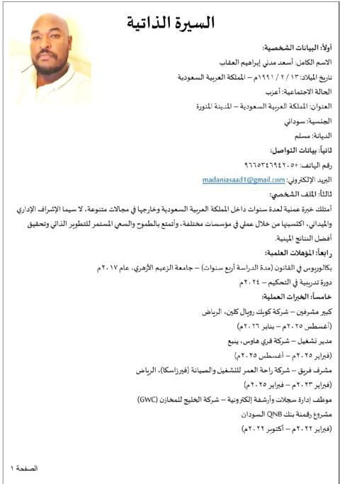 A Sudanese national, holding a Bachelor’s degree in Sharia and Law, with experience in electronic archiving and administrative supervision