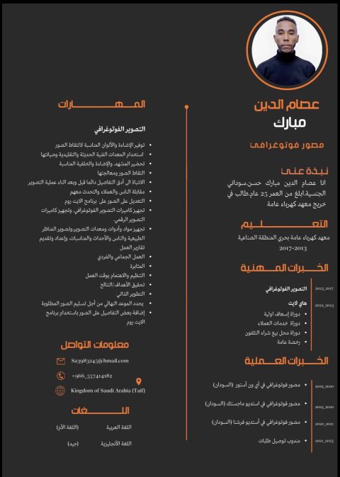 مصور فوتوغرافي سوداني الجنسية أملك إقامة المملكة العربية السعودية الإقامة سارية مفعول مصور فوتوفرافي وفيديو أجيد العمل الجماعي والفردي وتصوير جميع المناسبات والاحتفالات وأتحمل الضغط عمل مهم كان أملك رخصة قيادة خاصه اشتغلت مناسبات عديدة من شركات داخل المملكة وخارج المملكة السعودية