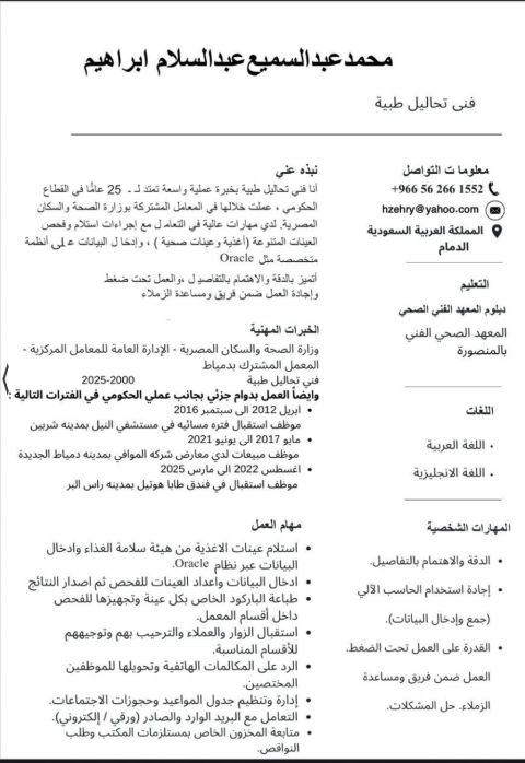 سوداني في (القصيم) خبرة أكثر من عشرة سنوات في مكتب خدمات عامة وشركة مقاولات قسم الحسابات وإدارة الموظفين. العمل علي المواقع الالكترونية بما فيها مواقع مكتب العمل والجوازات مقيم ابشر قوي والتأمينات الاجتماعية والغرف التجارية المركز السعودي للأعمال السجلات التجارية والتأمين الصحي والمواقع البنكية، الخ خبرة في تجارة مواد السباكة والكهرباء والبناء والأدوات الكهربائية، ملم بالأعمال المعمارية