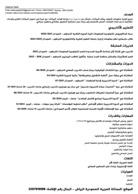 زكريا منصور قايد يمني الجنسية خريج تقنية معلومات مقيم في الرياض حي ظهرة لبن شارع الطائف امتلك مهارات في تحليل البيانات (Excel / Power BI) ابحث عن فرصة عمل في مجال تقنية المعلومات تحليل البيانات مدخل بيانات السكرتارية التنفيذية أو في مجال الاستقبال وخدمات العملاء