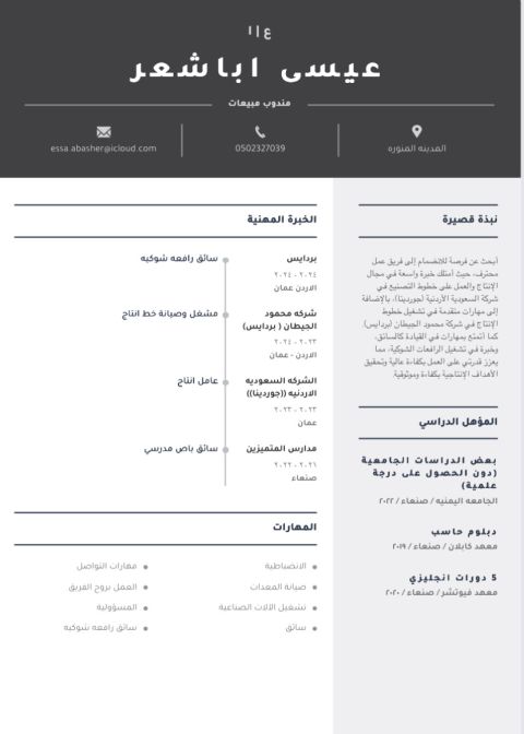 عايد الخطيب الجنسية يمني العمر 28 أحمل رخصة قيادة نقل خفيف يوجد لدي اقامة سارية وابحث عن عمل ساق باص أو ساق دينه أو نقل خفيف أو سائق خاص الخيرات (كملت مندوب توصيل لدى شركة فواكه وخضروات فرع الرياض وفرع جدة لمدة سنة و6 أشهر عملت مندوب توصيل لدى شركة أرامكس لمدة 6 أشهر عملت في محلا ملابس)