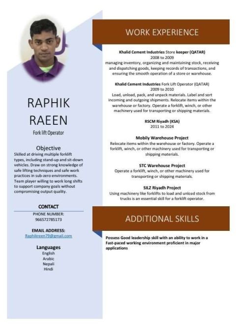I need job for forklift operator in Riyadh, Dammam, Mecca, Madina