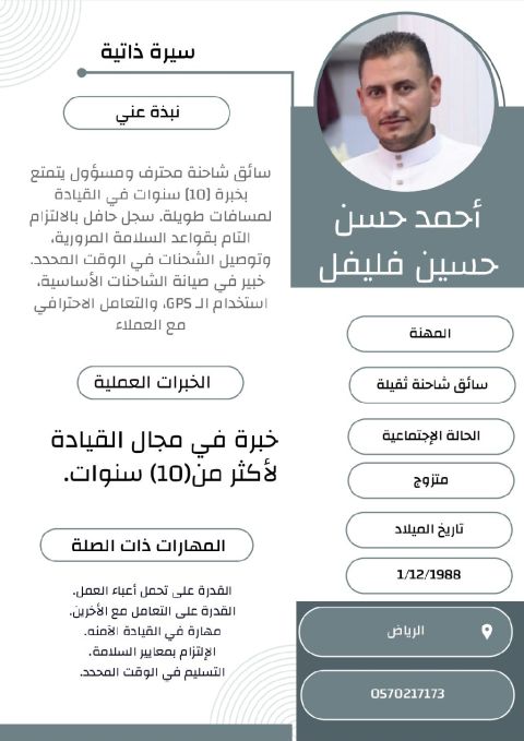 I am a driver residing in the Kingdom of Saudi Arabia. I have decided to work in the field of driving, whether for a company or as a private driver. I am well - mannered and presentable, and I am very God - fearing. I am willing to transport light goods. I have a Bachelor's degree in Social Work
