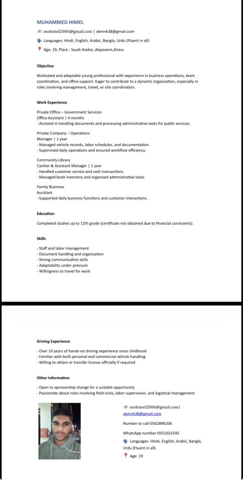 مساء الخير جميعا، ابحث حاليا عن وظيفة مناسبة أقدر أقدم فيها خبرتي ومهاراتي وأتطور بشكل أفضل. عندي شغف بالعمل، والتزام عالي، واستعداد أتعلم واعطي أكثر من المطلوب. اذا فيه أي جهة تبحث عن شخص مجتهد وطموح، أو تعرفون فرصة مناسبة، يشرفني التواصل على الخاص. شاكر ومقدر لكم دعمكم