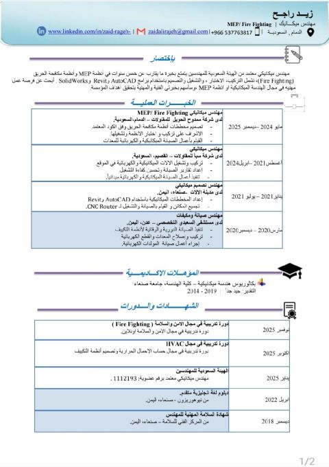 أنا المهندس زيد راجح مهندس ميكانيكا Fire Fighting، ولدي خبرة في مجال MEP (قراءة المخططات الميكانيكية والكهربائية والسباكه وتنفيذها) بخبرة ما يقارب 4 سنين في السعودية وخبرة كلية 5 سنين، أجيد استخدام برنامج التصميم الهندسي AutoCAD، ولدي عضوية الهيئة السعودية للمهندسين SCE، وموجود في السعودية