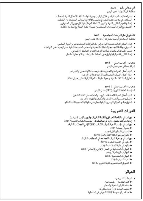 مهندس مدني يمني الجنسة خبرة في تنفيذ المخططات وأعمال التشطيبات وعمل المستخلصات مجيد الرسم على الاوتوكاد وملم في برنامج التصميم "الأيتاب" وبرامج الأوفيس ولدي القدرة على العمل في الموقع والمكتب الفني كما لي الحماس في العمل والقدرة على تحمل ضغط العمل خبرة سنة في تشطيبات الفلل وفي أعمال المكتب الفني في المملكة العربية السعودية وأربع سنوات خبرة في اليمن