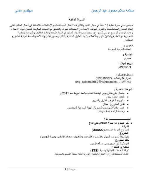 مهندس مدني ابحث عن فرصة عمل في أي منطقة بالمملكة وحاليا مقيم في القصيم بريدة خبرة عملية 13 عاما في مجال التنفيذ والاشراف لأعمال البنية التحتية والإنشاءات والخرسانات والتشطيبات، بالاضافة الى أعمال المكتب الفني اعداد الحصر والمستخلصات والتقارير لموقف الأعمال، والاعتمادات للمواد، والتنسيق مع الجهات الحكومية لضمان جودة الأعمال، والالتزام بمعايير الأمن والسلامة والصحة المهنية للمشاريع المختلفة. مرفق CV